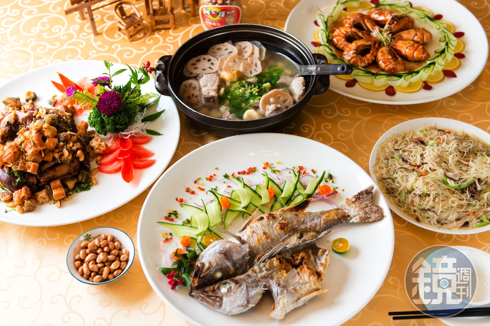 像是預訂才吃得到的招牌菜「狀元豬腳」,就有別於一般筍絲滷煮做法,選擇膠質豐富的豬前蹄,搭配草果、桂皮等近10種中藥材,細火慢滷4小時,再送進烤箱,將外皮烤到酥脆,上桌前還結合川菜「宮保」做法,大火爆炒油條、花生及皮蛋,點綴在豬腳上,吃來外皮酥香Q韌,肉質軟嫩且帶中藥香,最後來點酥香油條與皮蛋,味覺層次豐富。