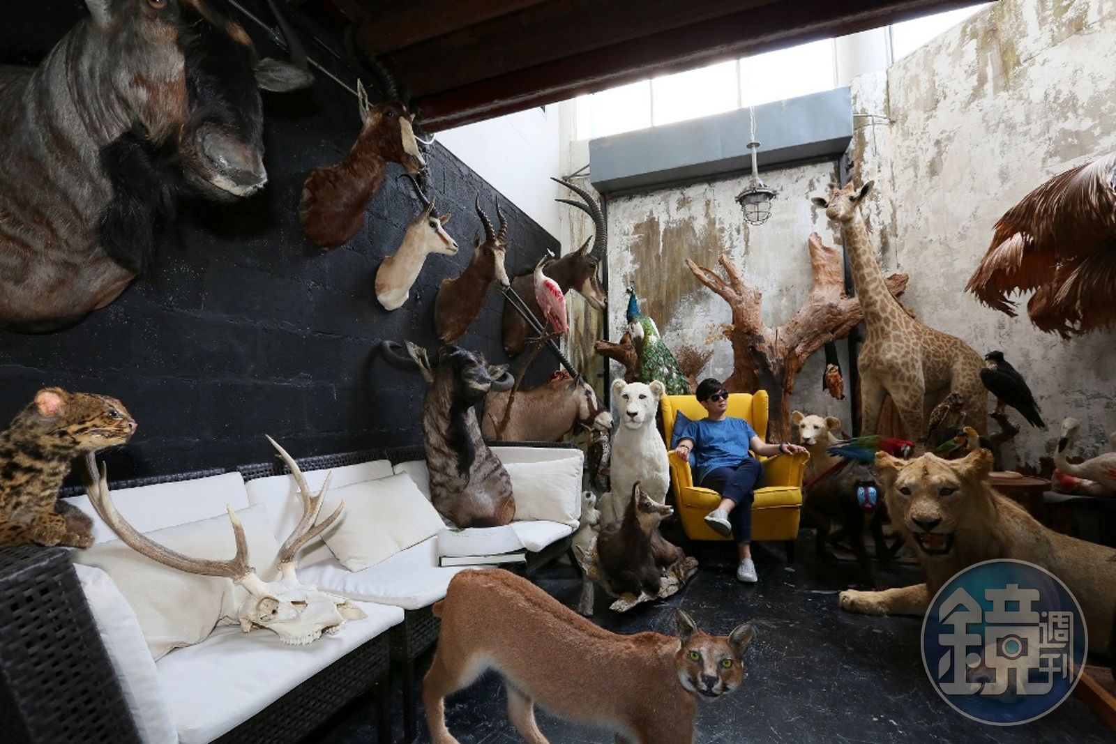 走進小房間,數十隻的動物標本,從長頸鹿到獅子、羚羊、孔雀全在房間出現,張牙舞爪的神情宛若活體。屋子正中央有一張鮮黃色的椅子,「你走過去,我要拍照。」攝影命令我,「我不敢啦,那些動物很真實。」,走近一步,眼前一隻北極熊瞪大眼看著我,嚇得我倒退不只三步。