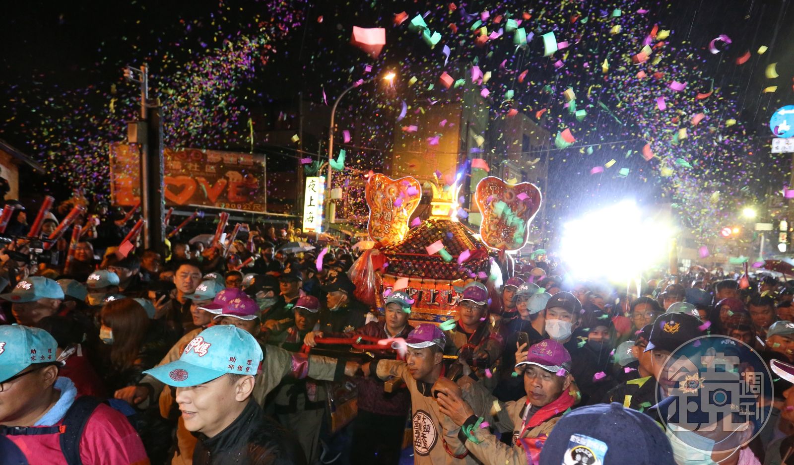 媽祖鑾轎行經彰化市民生地下道前,等侯已久的民眾拉開拉炮,彩紙漫天飛舞,迎接媽祖到來。