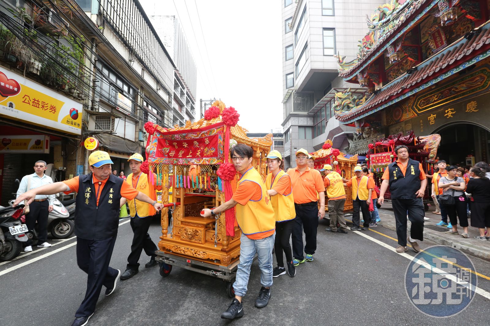 農曆3月23日早晨約莫9點,慶安宮內的三尊媽祖被廟方請至神轎上,隨後將轎子抬至廟前的特殊高台。這兒的鑽轎底不同於他處,高約100公分的高台,將轎子穩穩架於上頭。