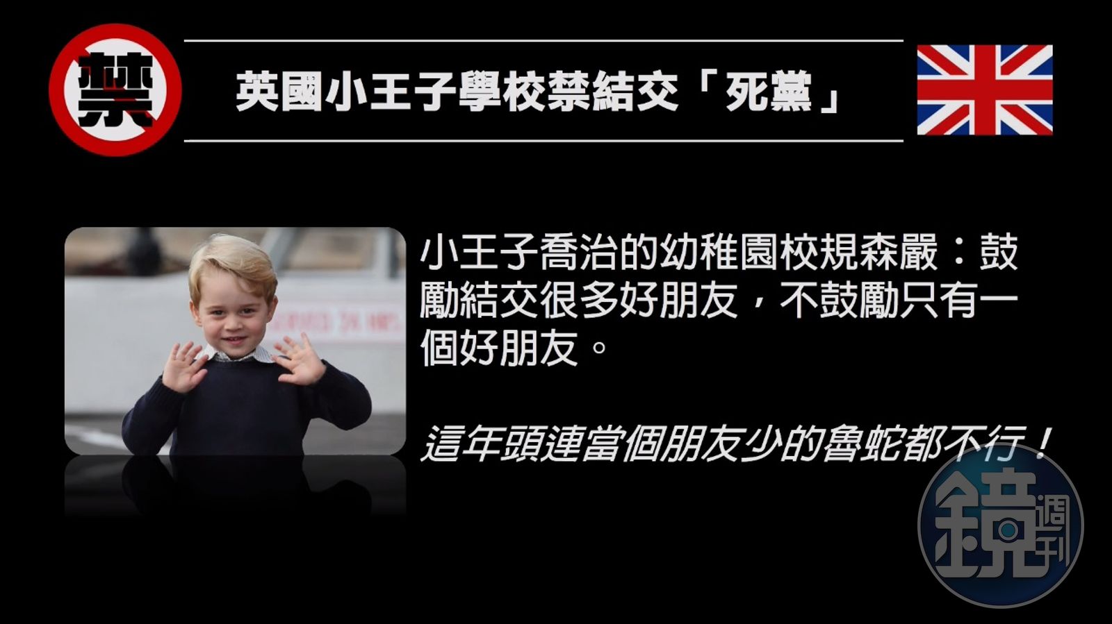 2017.06.02 12:49 臺北時間【少年郎看過來】禁禁禁!讓你大開眼界的「全球18禁」!時事發布時間:2017.06.02 12:49 臺北時間更新時間:2023.09.12 20:24 臺北時間文 黃申主播智偉已複製連結贊助本文加入訂閱會員禁禁禁!光是這兩個月,全世界各國就有數不完的禁事。 你有想過孔子在世的話可能會被「和諧」嗎?或者是在加拿大喝美粒果會引來警察關切?又可能你在阿聯酋因為簽上了自己的英文姓名而被逮捕! 鏡視野特別蒐集最離奇噴飯的「全球18禁」,讓你在哭笑不得之際大大擴展國際觀!更新時間|2023.09.12 20:24 臺北時間延伸閱讀不跟梅克爾握手!川普在怕什麼?肢體語言專家來解讀打瞌睡、坐姿不恭... 高射砲處決? 金正恩的恐怖統治【北韓女刺客】致命女人香 北韓的女特務兵團愛上提著人頭的IS聖戰士 變節女探員讓FBI顏面掃地小編顯神通!英美祭出電子禁令 阿拉伯航空推特搞笑回應「鬥陣俱樂部」!聯航成網友爆笑惡搞對象聯航公關危機 企業該學到什麼支持鏡週刊小心意大意義小額贊助鏡週刊!贊助本文每期 $35 元動態話題報導無限閱讀解鎖新鮮事加入訂閱會員鏡週刊加入追蹤訂閱下載鏡週刊加入追蹤訂閱下載更多內容,歡迎 鏡週刊紙本雜誌、鏡週刊數位訂閱、了解內容授權資訊。獨家深度分析報導線上閱讀