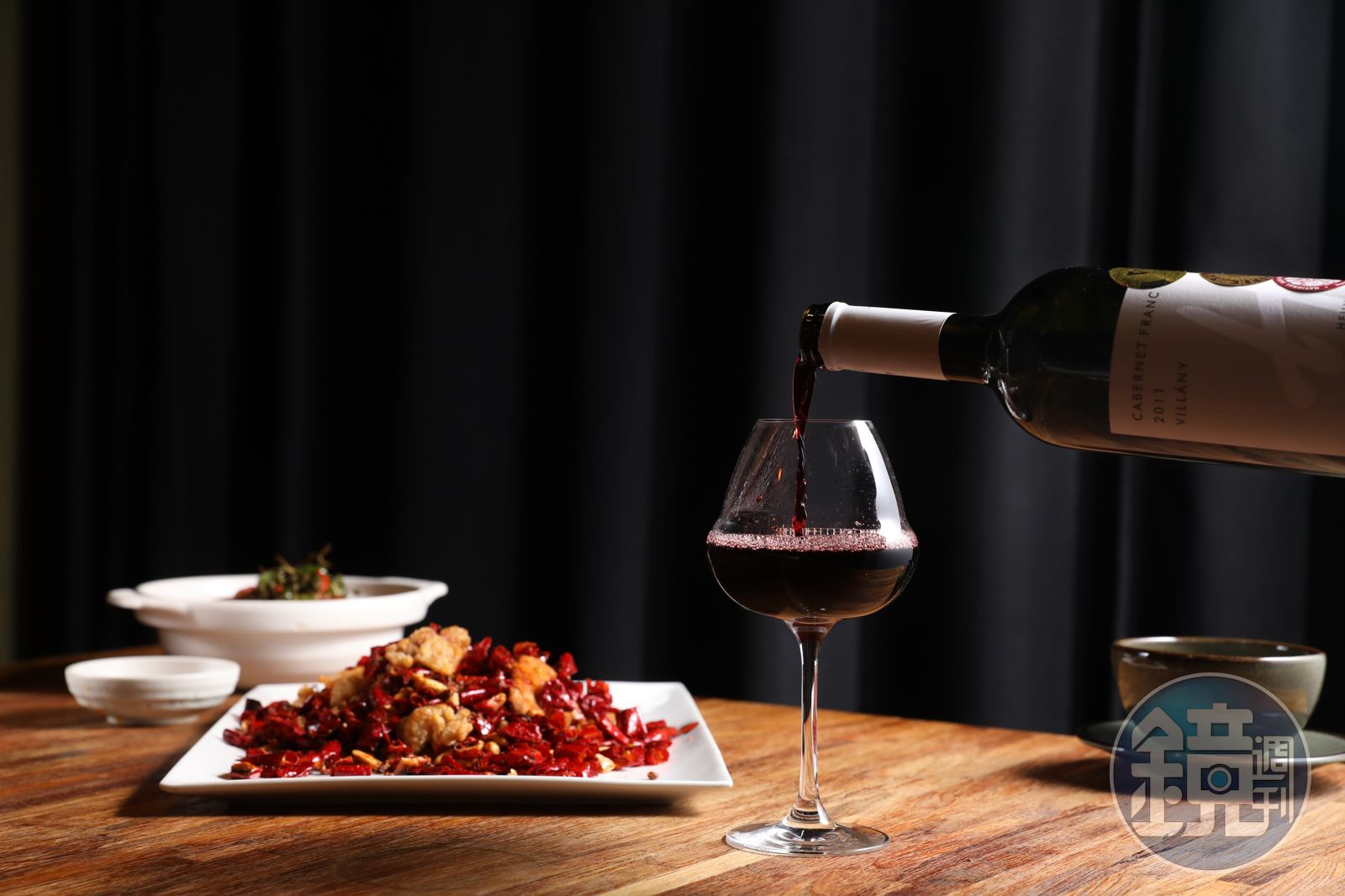 首先,謝庭涵選擇以100%匈牙利原生種葡萄 Kékfrankos釀製的「Weninger Kékfrankos Balf 2013」搭配經典川菜「歌樂山辣子雞」與「蓮子蹄花煲」,她的理由是經過油炸的辣子雞,適合搭紅酒,但若是選單寧太高的酒款,反而會帶出苦味,而用醬油滷過的蹄花,同樣不適合風味太過複雜的紅酒。