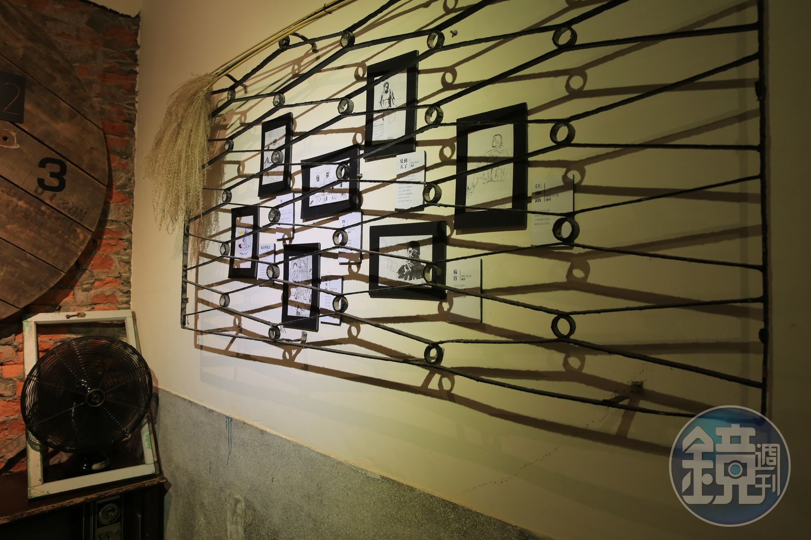 鐵窗下的鋼筆繪畫,以黑白色調塗鴉囚犯蹲在黑牢扒飯,身旁就是糞坑,配上四行短語,「牢飯不用錢,全國人民養,沒有美味餐,只有大鍋炒。」這是獄卒畫家林文蔚的作品,咖啡館女主人江琇鈴看了他的創作書《獄卒不畫會死》,主動找上他辦展。