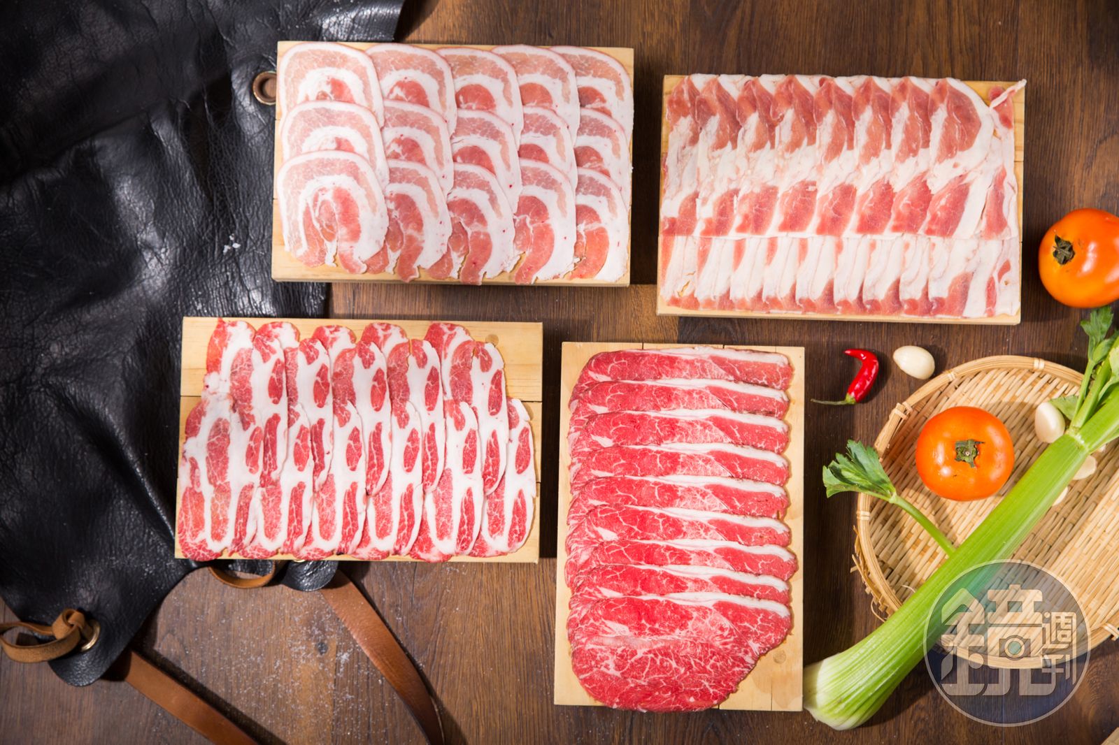 既然敢自稱肉舖火鍋,鎮店之寶—肉,想必是厲害角色。廚房前端以紅色帆布、玻璃櫃打造出西式肉舖質感,肉櫃內台灣、日本、美國、澳洲、匈牙利各地高級肉品原塊一字排開,肥瘦油花一目瞭然,肉櫃溫度控制在負5度至負10度之間,讓肉塊緩慢解凍4小時才能放上切肉機切片,確保肉片入鍋涮煮後的鮮甜。
