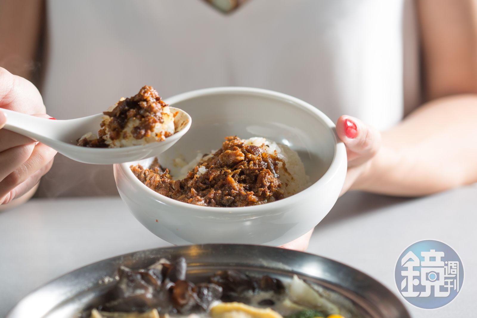 肉燥用的是店裡切肉剩下的邊角,陳冠翰透露:「其中含量很高的是伊比利豬梅花肉哦!」套餐加購一碗30元銅板價,就能吃到伊比利豬梅花肉燥,確實超值。肉燥香氣逼人,能好好扒住米飯,紅蘿蔔味道又幾乎匿跡,實在好吃。
