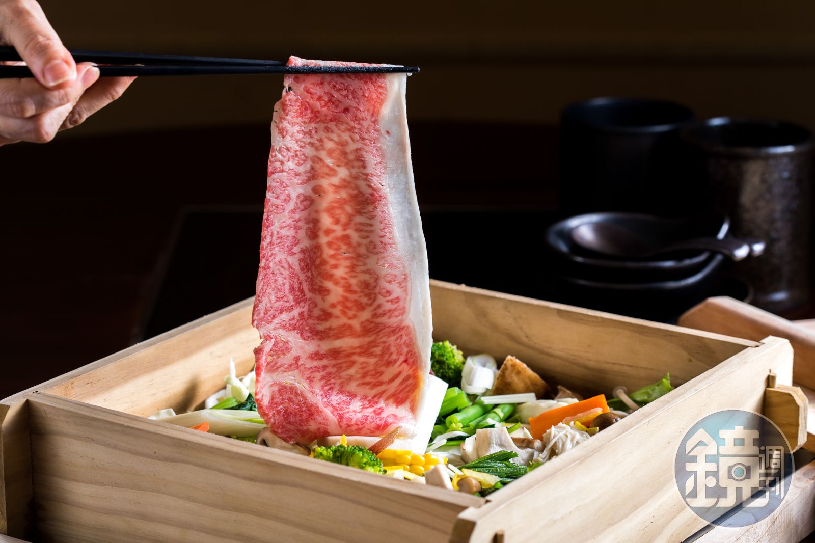 台北晶華酒店「三燔本家」協理張淑慧從秀肉盤、把沙朗肉片輕緩鋪入蒸籠、加蓋、一氣呵成,經3分鐘的磨人等待,掀蓋後的「蔬菜蒸籠蒸盛合」蒸氣裊裊,乳白微縮的和牛肉片正軟滑地撫著蔬菜,最後還要再淋上清酒。這木箱裡的景致香色勾人,我挾起薄透的肉片入口,一抹油潤肉香消化在舌尖,煞是銷魂。
