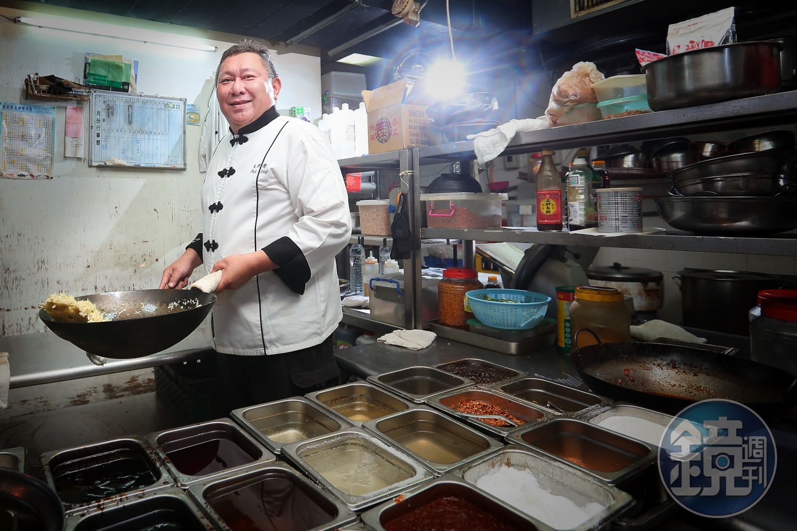 人稱「小米」的米國慶帶著2個徒弟與雜工駐鎮廚房,他一邊準備把燒了2小時收汁的乾燒魚頭上菜,一邊把握時間炸豬腳,「我用瞬間的油溫,把湯汁封住,拿剩下油溫,慢慢讓它熟,要是油溫不夠,外面酥不了、封不住,油溫太高又會糊掉,要做到外酥內嫩,一咬下就能感受到湯汁的豐潤,才是成功。」