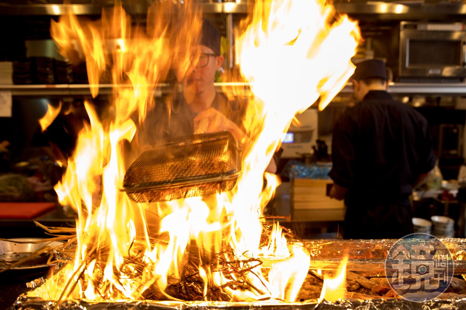 像是「稻草燒」先把雞腿肉放在網架裡,再以成束的稻草燻烤,烤檯上燃火冒煙,雞肉被炙得發黑後,何時燻到夠味,是有個性的炭香,而不是焦掉的苦味,全靠燒烤達人的判斷。
