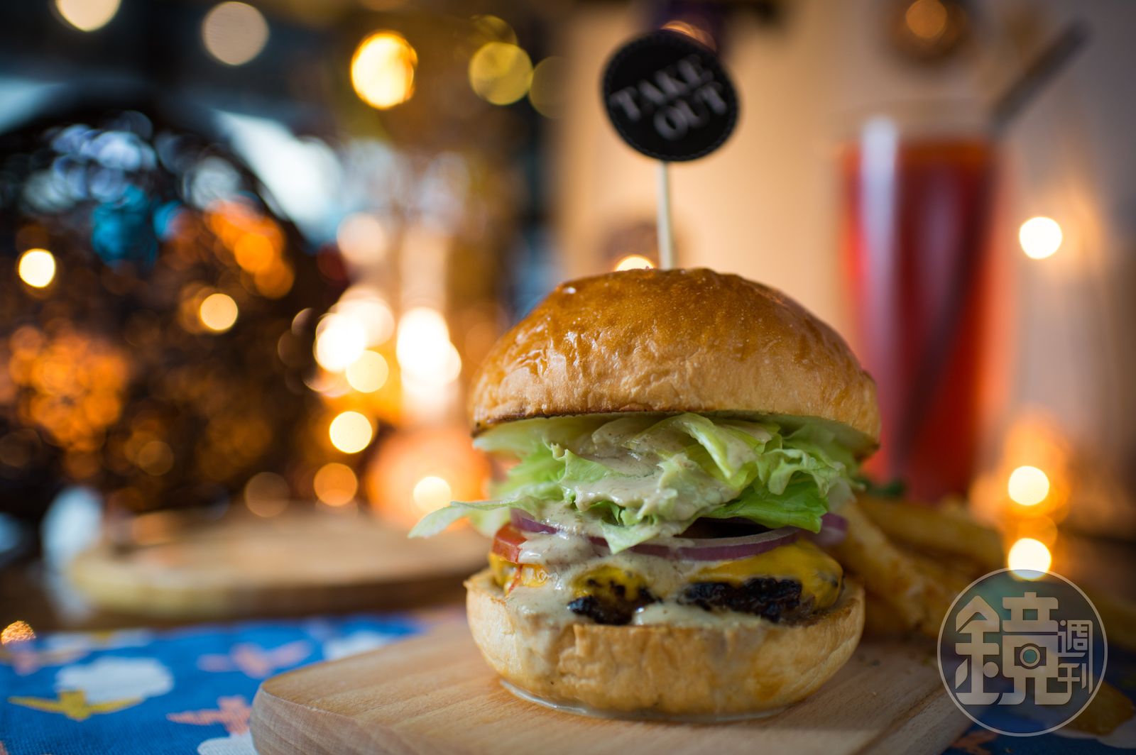 這是拍攝現場的環境。店內的桌子很高很窄,我選擇使用冰櫃的玻璃面來拍攝,在漢堡的10點鐘方向打一盞反射傘,傘面沒有全開,目的是讓光不要擴散得太廣,以免打到後方的耶誕燈,就沒氣氛了。反射傘的對角線補一片反光板,讓暗部陰影柔順一些。