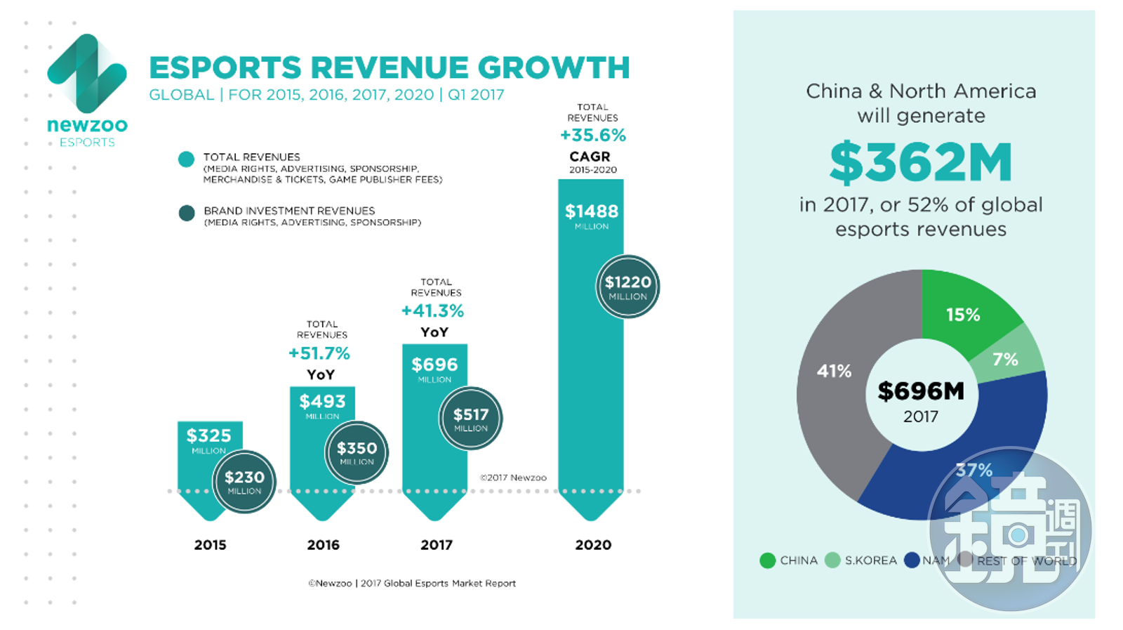 根據遊戲市調公司 Newzoo 在本月 15 日出爐最新數據, 2017 年全球的電競市場收入達到 6.96 億美元,比起去年有 4 成的大幅成長。 Newzoo 認為接下來仍會有 33 %的年度成長率,預期到 2020 年,電競產值將達到 14.88 億美元。