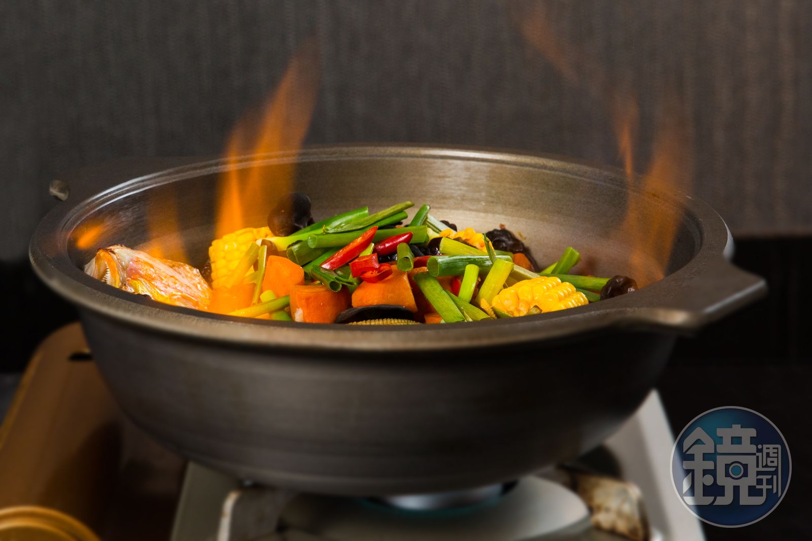 晶英軒招牌的「多種吃法」桌菜料理,元老級一食多吃「火焰石燒薩索雞」頗受台南在地人喜歡,去年加入生力軍「魚羊巴味鍋」,第一吃,吃的是重慶烤魚,主廚選用現流魚貨,精挑5、600克鮮魚,以馬告、萬壽菊、八角醃製、風乾、烘烤後放入有洋蔥、蔥段、蒜頭、乾辣椒的熱鍋裡,開動前,還會上演桌邊秀,往熱鍋澆淋特製藥酒,點火嗆香,藥酒香氣瀰漫空間,讓人食欲隨著火光高漲。