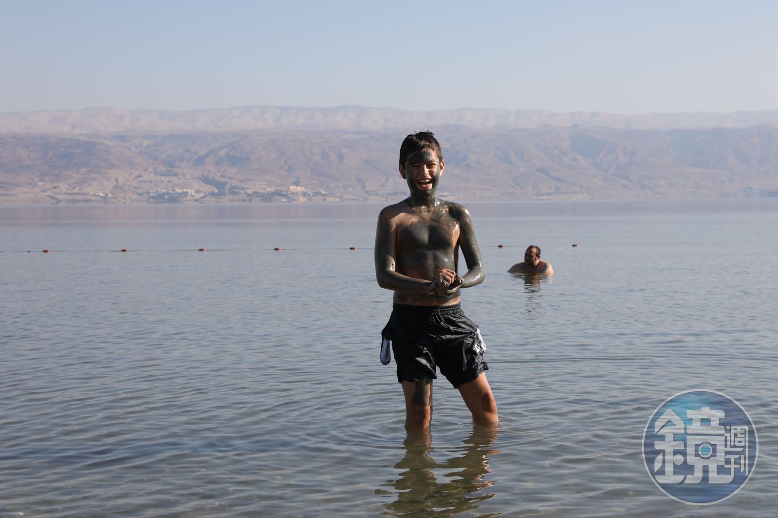 當我感受著自己的浮力,泡得靈魂出竅時,一群來自地中海島國賽浦勒斯的男人一邊徒手挖著岸邊的黑泥,一邊說笑著加入漂浮的行列,我順手把自家雜誌丟給其中一人,沒想到不識中文的他翻得津津有味,讓一對以色列父子看得發笑。爸爸說,他小時候的死海高度有對面小山頭那麼高,近年死海水位每年下降一公尺,讓他憂心死海乾涸,小孩長大就沒法享受這種自在漂浮的樂趣,所以一有機會就帶兒子來玩。