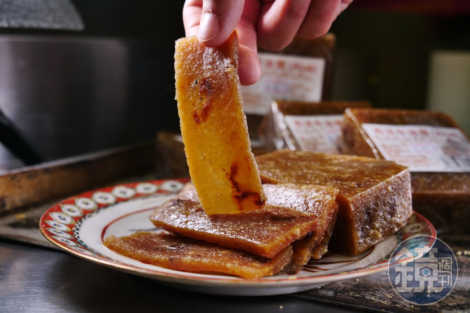 金燕的招牌糕點,是許多店家已放棄手做的「牛油糕」,她帶我們進入店鋪2樓的工作室,這裡空間狹窄、悶熱,她指著地上幾塊突起的石頭說,「這是讓我的腳頂著,因為牛油糕愈煮愈容易結塊,愈煮愈辛苦,如果沒有石頭支撐全身力量,光靠上半身,根本攪不動,若鍋底黏住,這鍋就沒用了。」