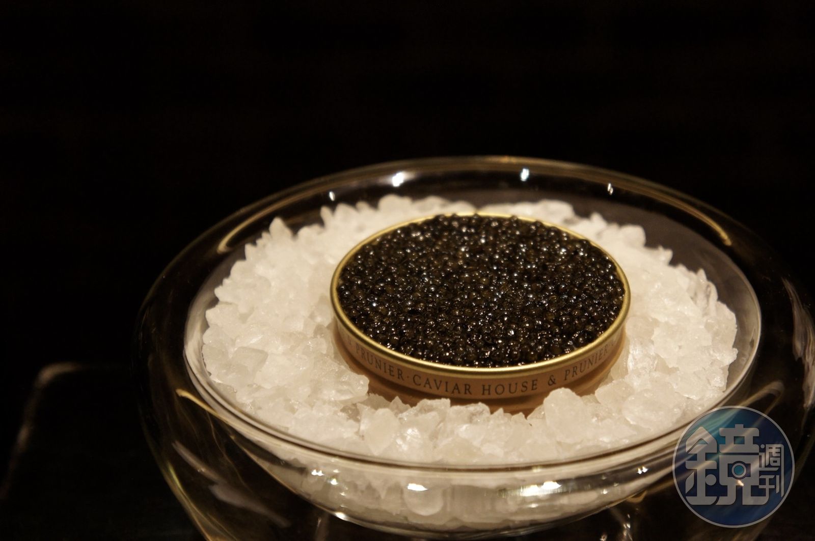 第二道像是放在碎冰塊上冰鎮的一盒魚子醬,味道耐人尋味,菜名為「 鱈場蟹」。弗雷德里克‧安東得在魚子醬形狀扁盒內先填上一層蒔蘿奶油、放上入蟹肉芥末美乃滋,鋪上魚子醬,點上青檸檬皮絲。一匙挖下送入嘴裡,結果不只海味來襲,還多了暖調的辛香料蔓延開來,原來蟹肉芥末美乃滋中加了咖哩,這讓一向身段高雅的法式餐點多了亞洲風味,這下親切多了。