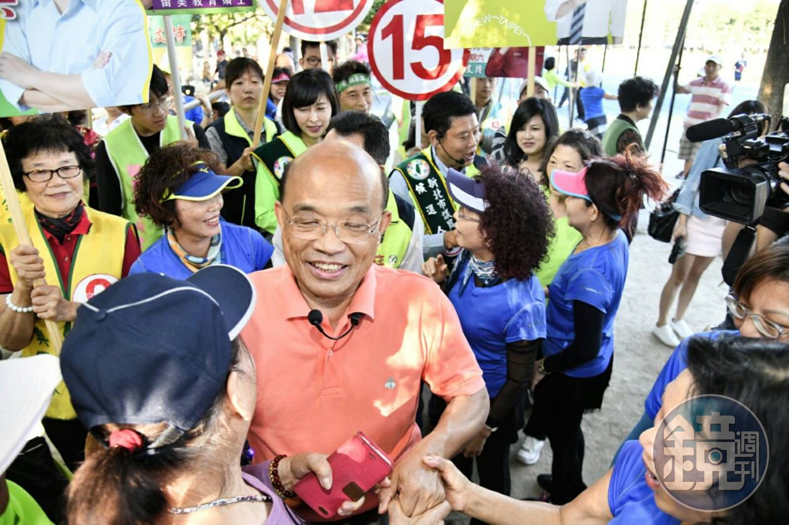 蘇辦今也公布蘇貞昌競選影片「速度篇」蘇貞昌在影片中脫掉外套、捲起袖口、彎腰暖身,最後全力向前衝。而蘇自週二起已連3天與行政院長賴清德合體車隊掃街,賴受訪時還助攻對手大群館及新莊購地爭議,可說火力十足。