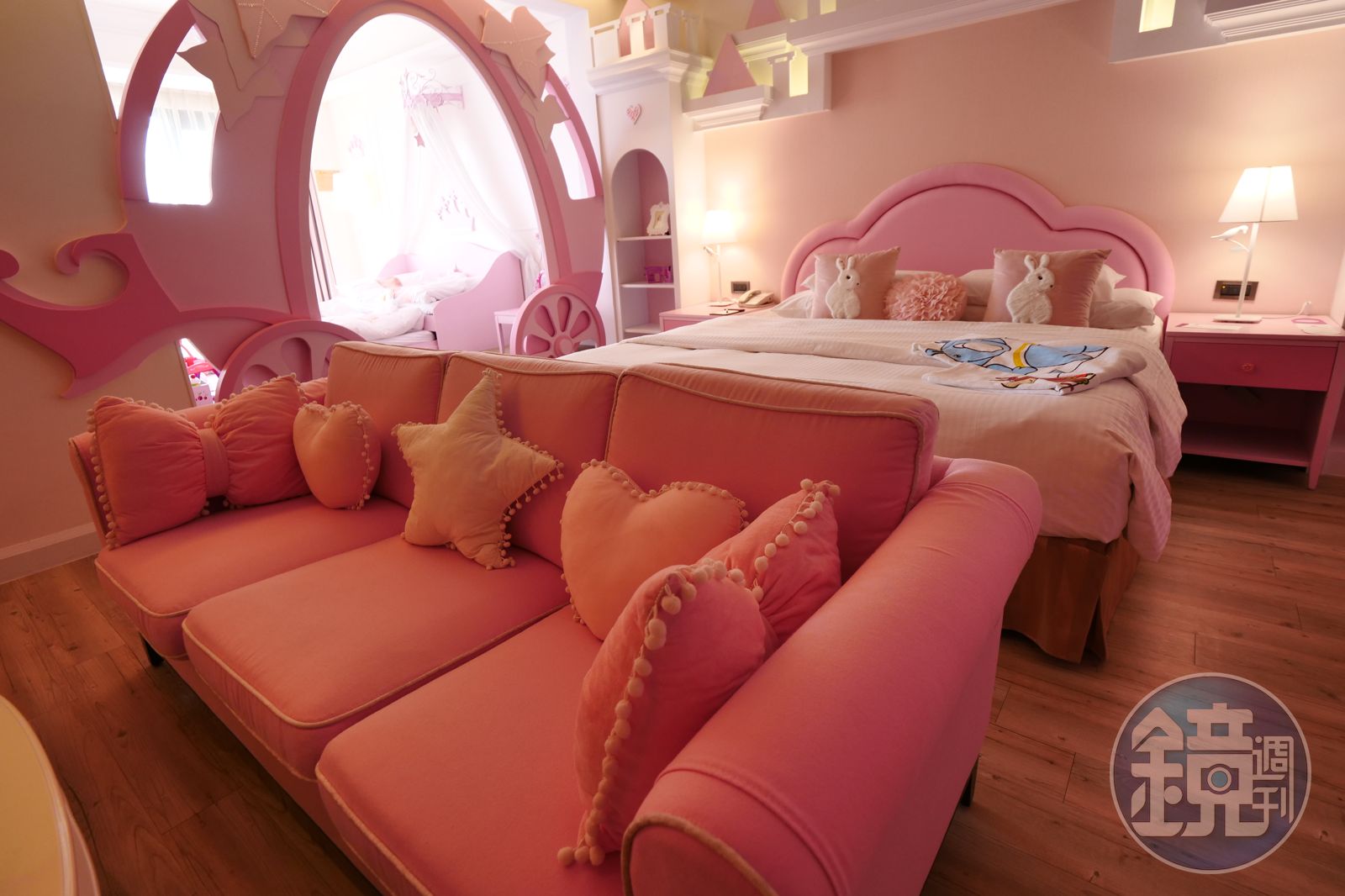這日我入住充滿粉紅色夢幻風格的「公主房」,屋子裡頭有馬車造型的小朋友睡床,充滿城堡氣息的起居空間,是最受歡迎的房型。