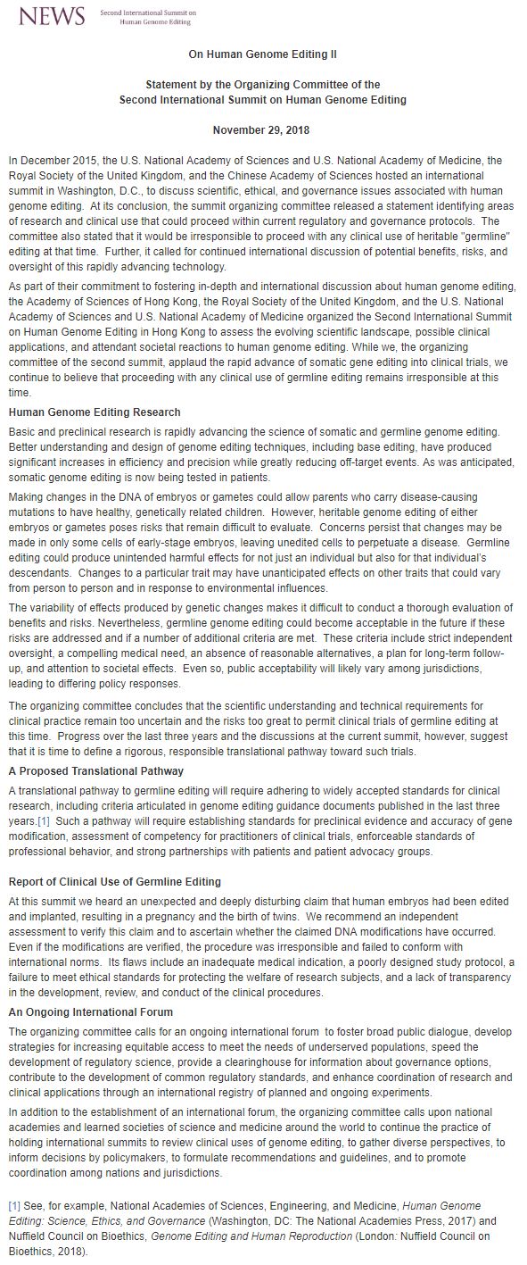 在這次峰會上,我們聽到一個令人意外且令人深感不安的資訊,即人類胚胎經過編輯和移植,已經導致懷孕和一對雙胞胎的誕生。我們建議進行獨立評估以確認消息所聲稱的 DNA 修飾是否已發生。即使消息得到驗證,該做法也是不負責任,不符合國際規範的。其問題包括醫學適應症不足,研究方案設計不合理,未能達到保護研究物件福利的道德標準,以及臨床程式的制定,審查和實施缺乏透明度。
