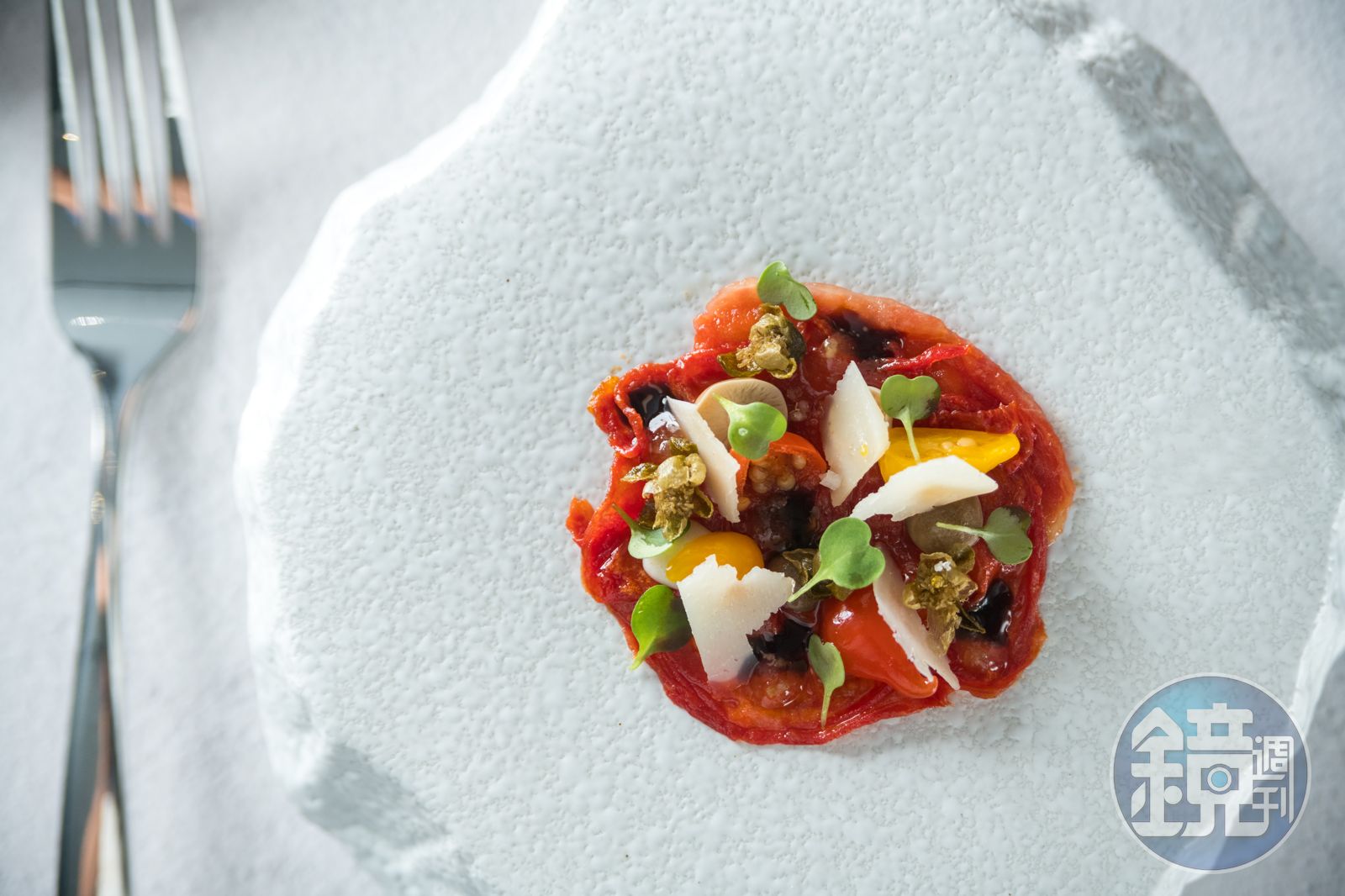 而最燒腦的,Vincent直指一顆番茄,光這道就用了6種不同的番茄,又各自以油封、燻烤、風乾及香料煙燻的工序處理,最後殘留的番茄汁加入寒天做成晶亮的外皮,配上象徵土壤的可可與黑橄欖粉,鹹甜多汁有如南部番茄盤。