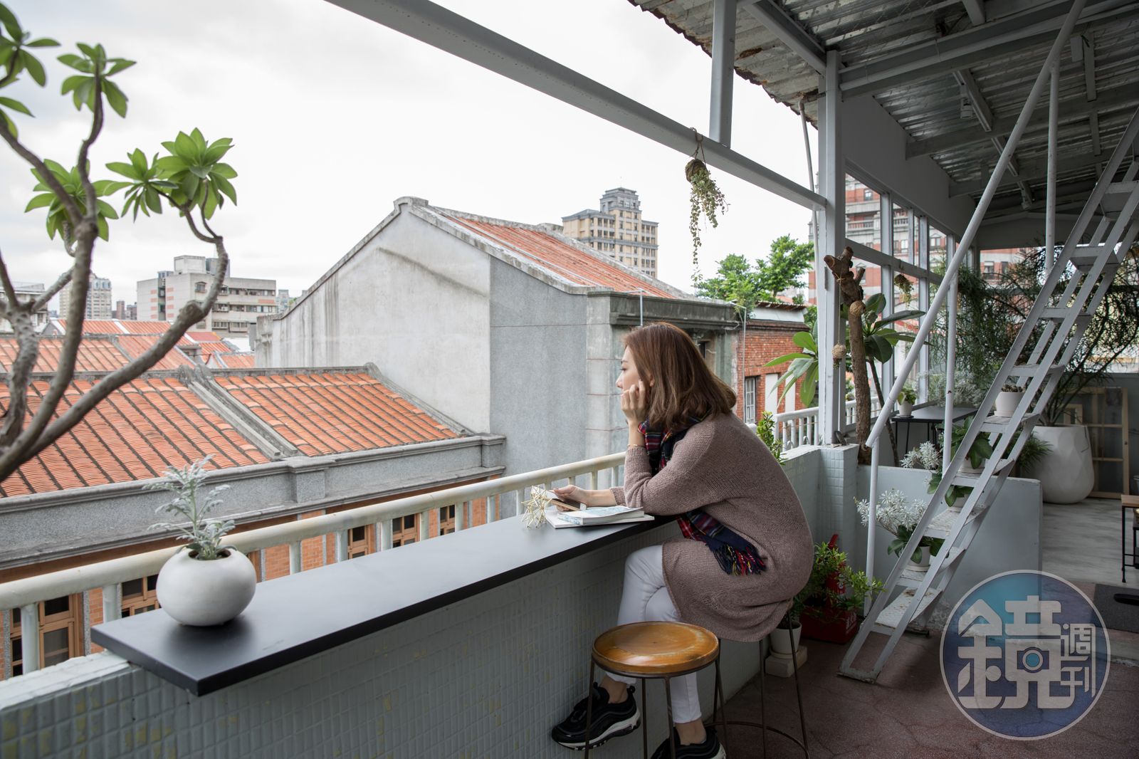 沿著階梯向上,屋頂上雙人房前有個好美的小陽台,陽台前放眼竟是連綿的街屋,橘紅色磚瓦層層鋪展。小旅店不只是住宿空間,更像小型劇場,隨著階梯一幕幕揭開,驚喜堆疊。我望著屋頂空間發呆時,小佩在我身邊喃喃說道,有這片風景,是租下這屋前未曾想像過的幸運。