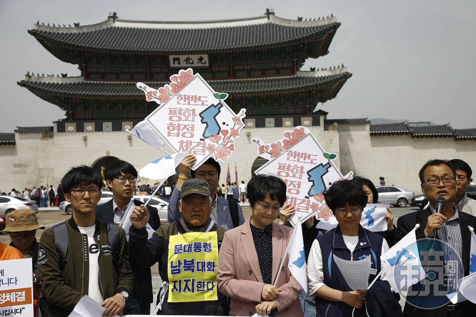 支持兩韓統一的南韓民眾,在高峰會期間在首爾光化門廣場以標語旗幟表達支持。(東方IC)