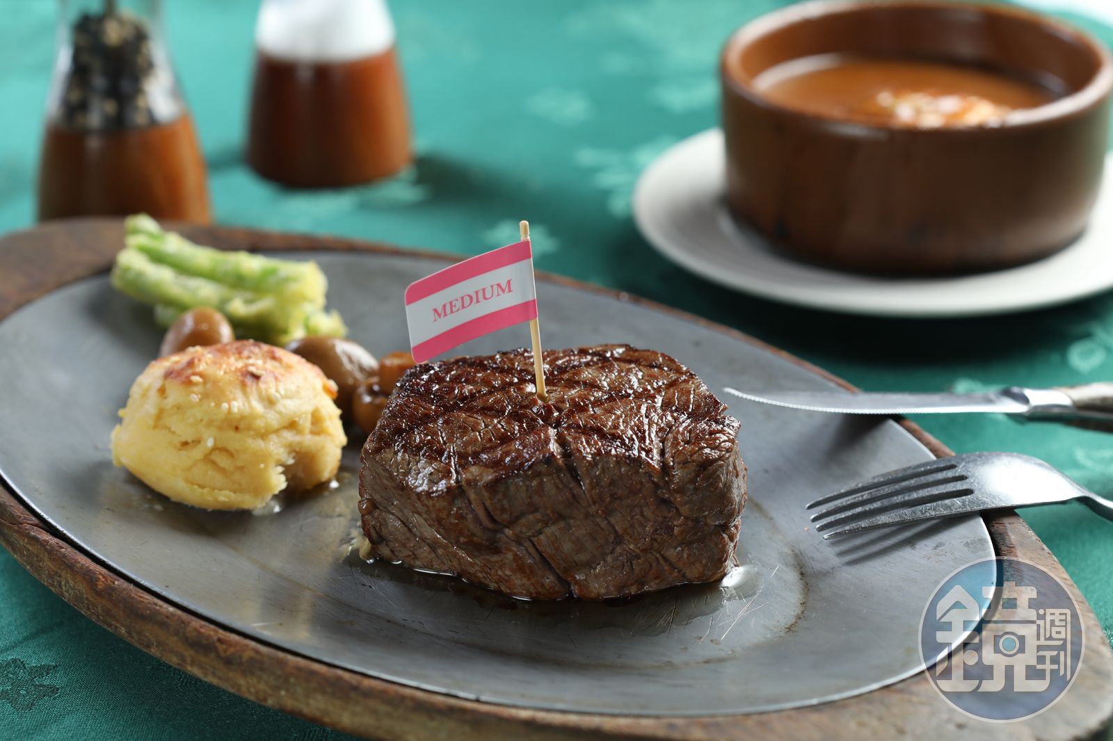 「頂級角尖牛排」插上標示熟度的旗子,放在燒得熱燙的鋁合金盤上桌,不用Cue,人們會快速打開面前的口布遮擋油漬,同時等待溫度稍降,放下口布後,服務生會端著2個神燈造型的牛排醬盅在桌間穿梭,問你要不要加醬。