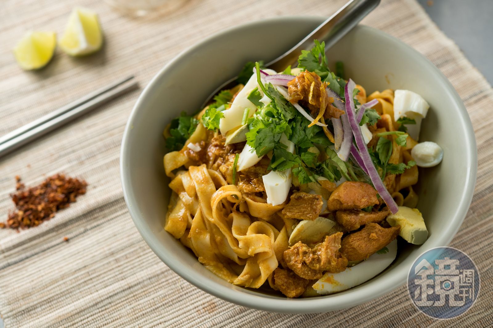 一入口,嘴裡瀰漫濃厚咖哩香,雞肉塊香嫩入味,覺得味道太重,一旁還有水煮蛋可以平衡,阿薇建議我擠點新鮮檸檬汁,味道變得爽口開胃,加點特製辣渣,會讓醬汁氣味更豐富。