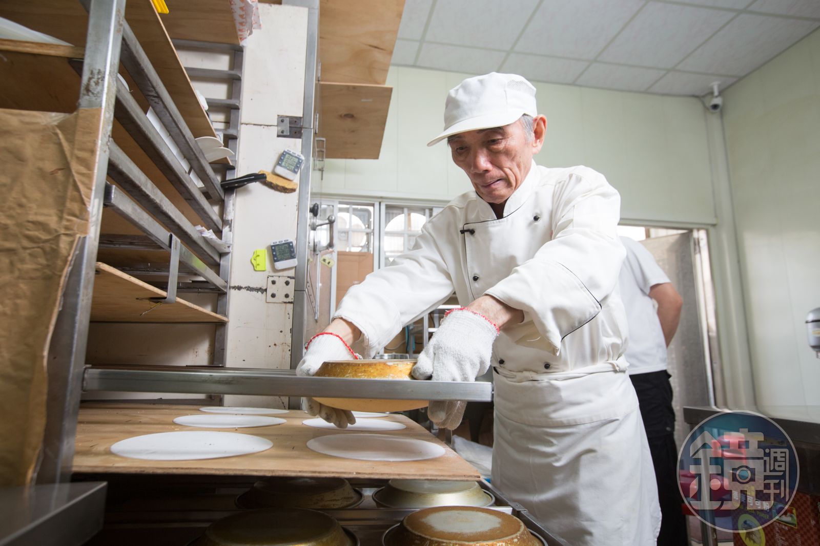 直到前2年,徐振彬才完全放手,「這個至少要學3年以上,很多竅門是靠感覺的,像打發鮮奶油餡,時間不一定,要用肉眼判斷。」魔鬼藏在每個小細節裡,波士頓派出爐後,徐若為立刻倒扣擺放,讓派倒立如蝙蝠,表面維持圓弧,「波斯頓派是戚風蛋糕的一種,難的是它表面沒塗奶油,所以烤出來必須是完整的,不能龜裂。」他手勢輕柔,小心翼翼呵護的不只是派,更是父親辛苦擦亮的招牌。