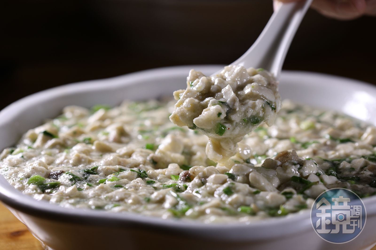 說到主食,這家飯館還有一道很特別的「粉蒸野菜」,上面是剁碎的野菜,下頭是白飯,一匙舀下去,便是意外美味的菜飯。最後來上一杯著名的「徽州米酒」,這裡的版本是像酒釀一樣,連米整杯端上桌,喝起來跟吃甜點差不多,格外有趣。