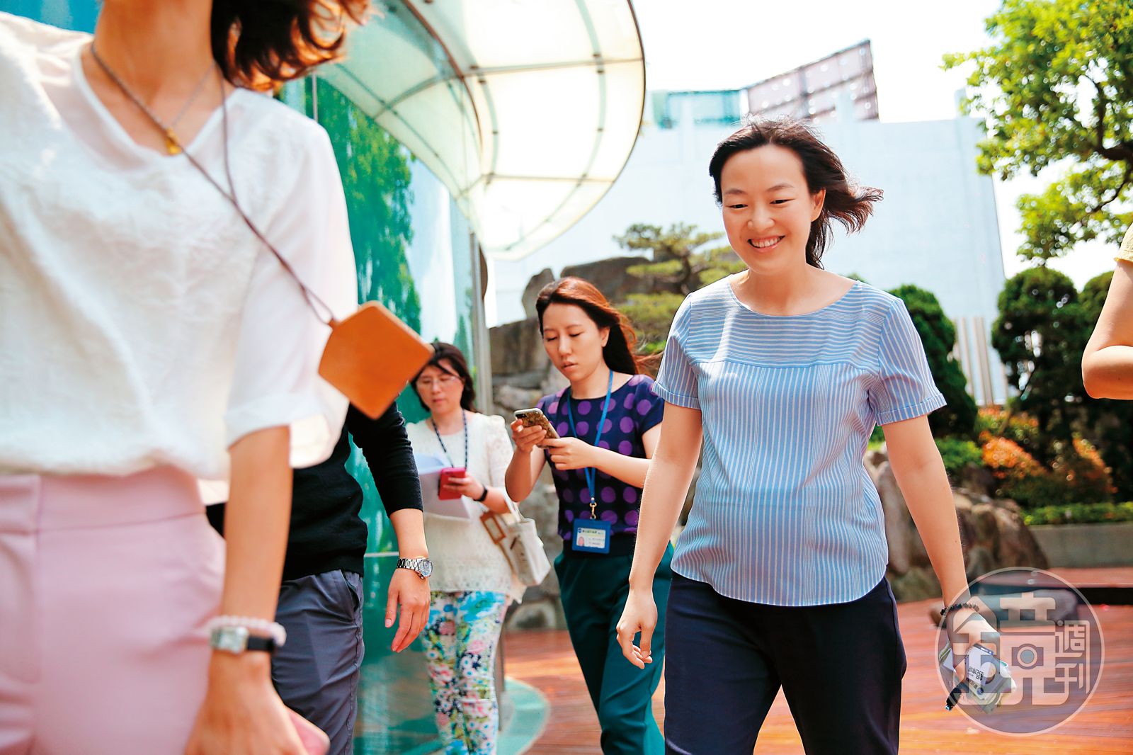身穿藍白色條紋罩衫搭配黑長褲、腳踏運動鞋的蔡佩君,一身俐落造型,雖然肚子微微隆起,明顯「孕」味十足,但她仍腳步神速,一馬當先帶著祕書、公司同仁從裕元酒店大門走出,視察位在裕元酒店旁,原是星巴克,準備改建為親子圖書館的玻璃屋。