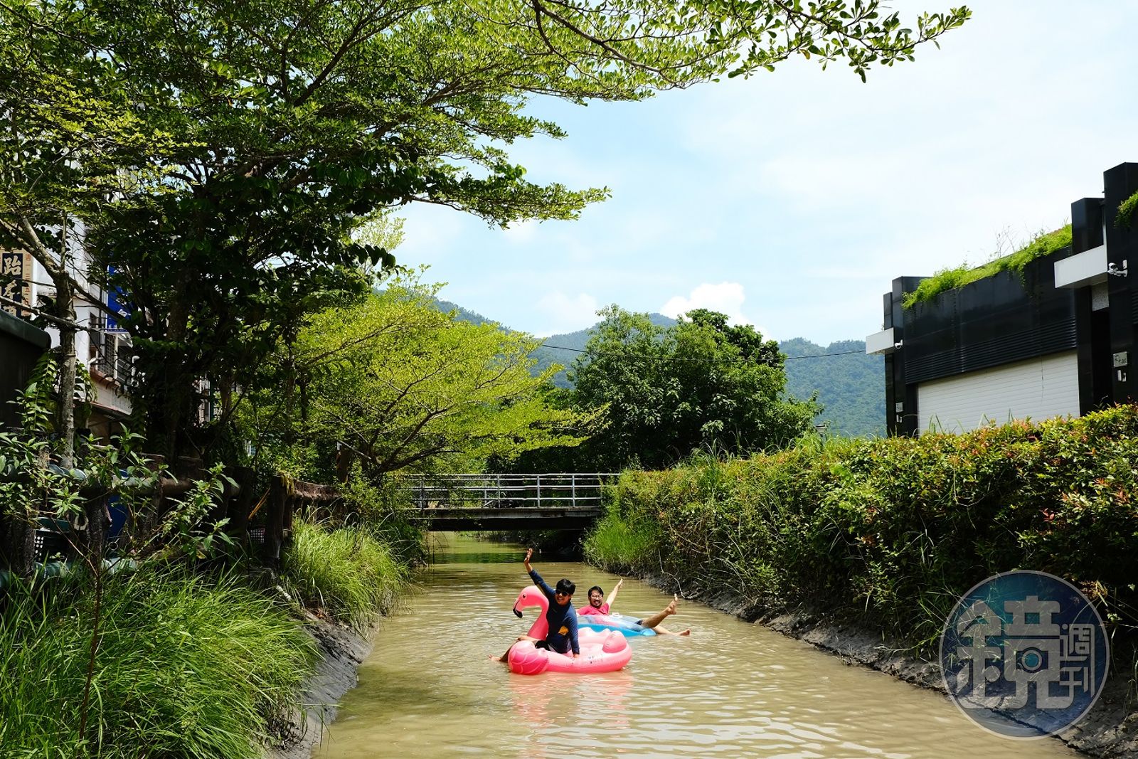 我帶了自己的泳圈順水漂流,天然水圳成了漂漂河,眼前是水,後方有山。踩著軟土步入水中,水順流向前,隨水流移動,周圍是安靜迷人的小鎮風景。瀰濃社區發展協會理事長鍾仁振說,美濃人自小依賴水圳生活,家門口的水圳為獅子頭圳的分支「下庄水圳」,過去不但是洗衣場,也是孩子們的玩水地點。