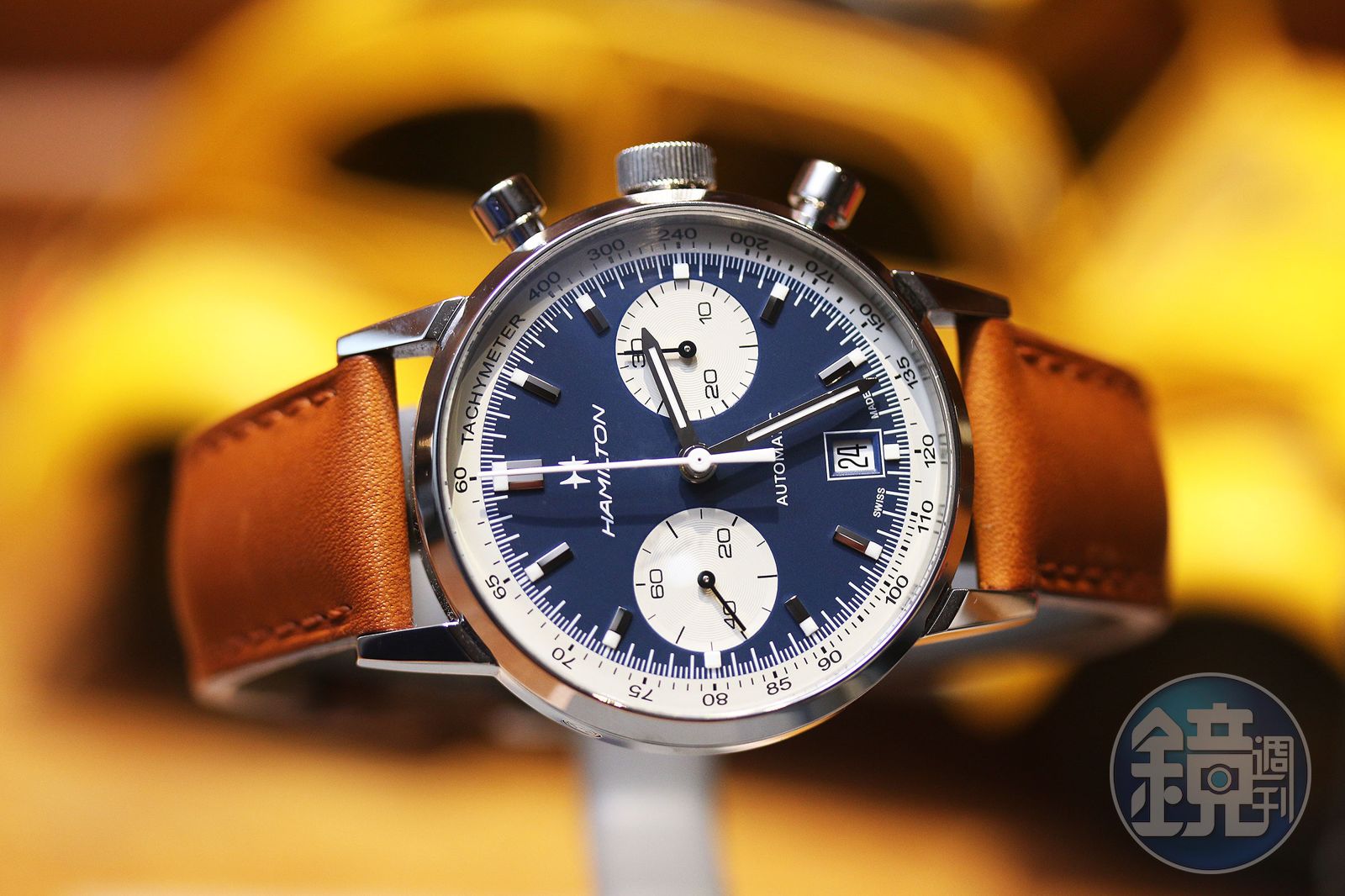 漢米爾頓的爵士大師系列(Jazzmaster)向來走斯文路線,今年品牌為此系列增添全新的計時碼錶功能版本,分別推出藍色、黑色與白色三種不同色面的作品。不管是指針、計時盤佈局與顏色,不同於上述提到的熊貓面,走得是更簡約俐落的風格,錶款裝載H-21自動上鏈機芯,動力儲存60小時,定價NT$56,200。