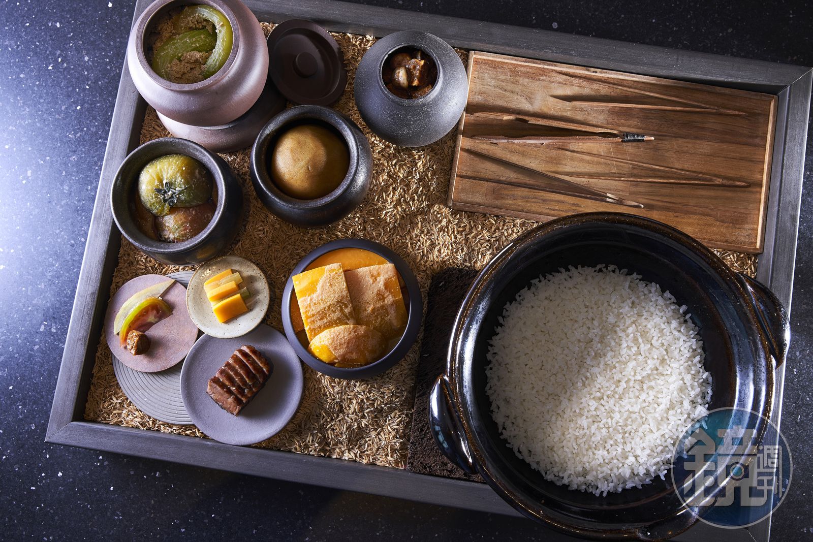 這一回試吃大會,連同帶回餐廳,總共試了將近10款米,最終桃園德穗米雀屏中選,而光是煮米,Aisha就練了7、8年,不但堅持用土樂窯烹煮,入鍋前還要以特定容器淘洗,篩除過小的米粒,再用茭白筍殼萃取的高湯浸泡半小時,煮至水分收乾,關火燜個10分鐘,開蓋鬆米後續悶5分鐘,端上來的米飯才能粒粒分明,飽滿泛著亮澤,入口富有彈性,黏性剛好。
