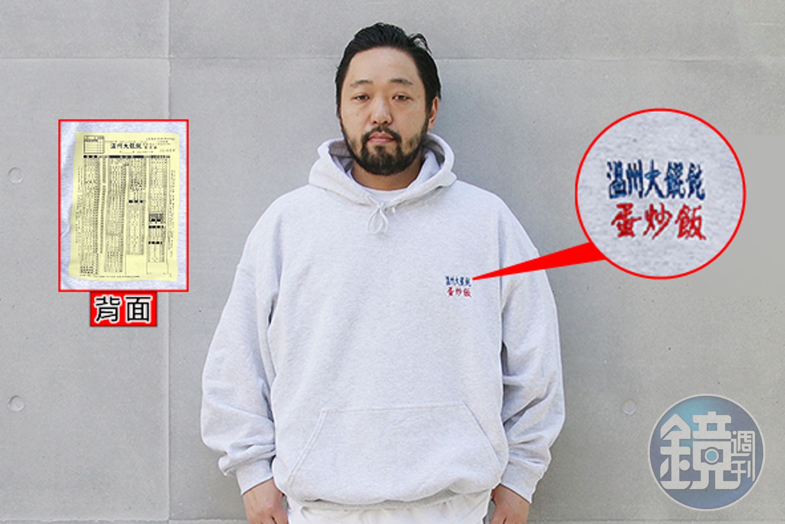 日本品牌使用台灣連鎖餐廳溫州大餛飩的配色及菜單,巧妙的設計到淺色帽T上,胸前是以中文寫著紅色「溫州大餛飩」,以及藍色「蛋炒飯」;帽T的背面,則是大喇喇地將溫州大餛飩淺黃色菜單整版露出,再仔細點看,還能發現這張菜單,是出自台北市忠孝東路四段的分店。
