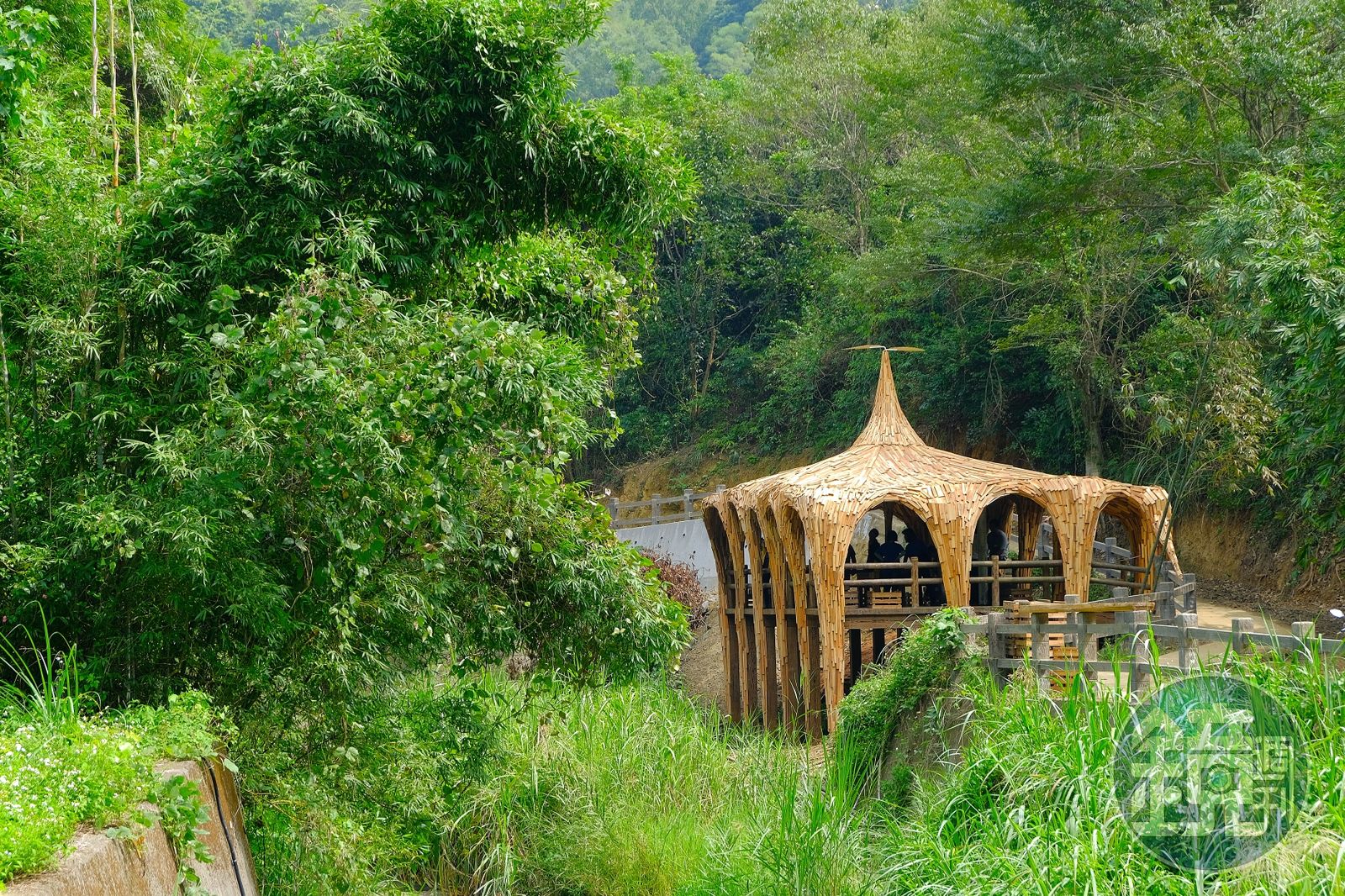 這塊土地上,還有范承宗用稻草與台灣木材打造出的《茶窩》。茶窩以在地「茶壽」為主軸,茶壽是苗栗汶水獨有的茶壺保溫方式,過去保溫設備不如今日,故用稻草編織出如鳥巢般的茶窩,用以保溫熱茶。如今此項手工藝逐漸消失,范承宗將此工藝用大尺寸重建。大小各一的茶窩,在山林中依存,也象徵親子關係的相互與獨立。