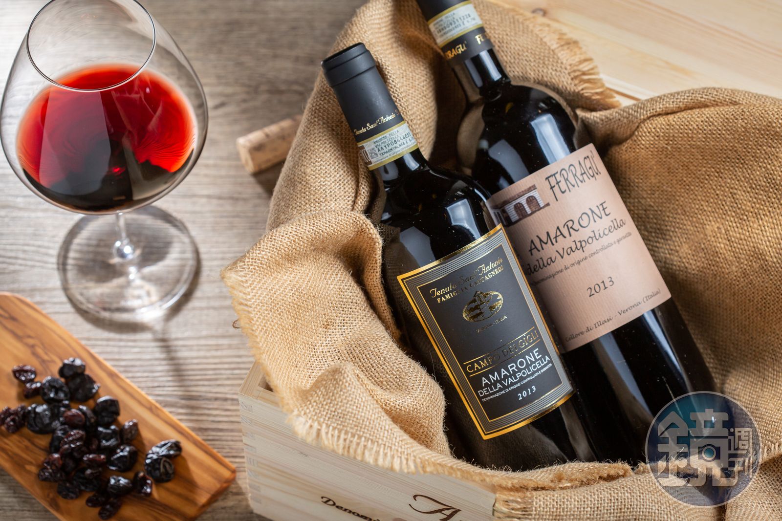 「Ripa della Volta Amarone della Valpolicella DOCG 2015」在柔潤單寧中藏有巧克力、皮革、乾果般成熟香氣。(2,800元/瓶) 「Domini Veneti Amarone della Valpolicella Classico DOCG 2013」具有柔順的酒體,烤過乾果般的後韻久久不散。(16,000元/6瓶、箱) Orione 的「Riserva DOC 2009」(左,3,900元/瓶)有酒漬櫻桃、李乾、玫瑰等甜香。Corte Merci 的「Classico DOCG」(中,3,200元/瓶)歷經多段桶陳,呈現典型Amarone的甘草、果乾、可可香氣。Franchini Costa d'Angelo 的「Classico Riserva DOCG」(右,5,200元/瓶),甜暖香氣引人聯想 到杏仁糖和皮革。 欲戴王冠,必承其重,渾厚霸氣的酒王,大肚型酒杯最能彰顯其細膩優雅的一面。也因為工序繁瑣,造價非凡,讓它被譽為適合一人獨享的「沈思之酒」,但其實它也可以不孤僻,與乾酪、燒烤紅肉等厚重料理,乃至於辛辣撒潑的川湘菜都可以是好朋友。