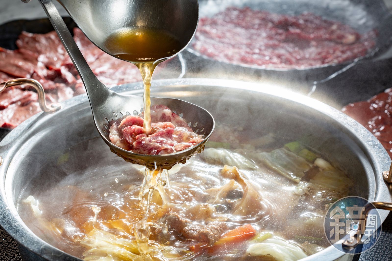 這樣的變通也顯示在牛肉上,只見他熟練地下手拉切出一整盤蜷曲如螺旋的肉盤,這個被稱為「圈圈肉」的肩胛肉,過去因為客人嫌小,很少被使用,但他把一整塊修筋修油後,整塊捲成圓柱再下刀,細瘦的肉片頓時變身油花豐美,下鍋輕涮牛油香完全被釋放。