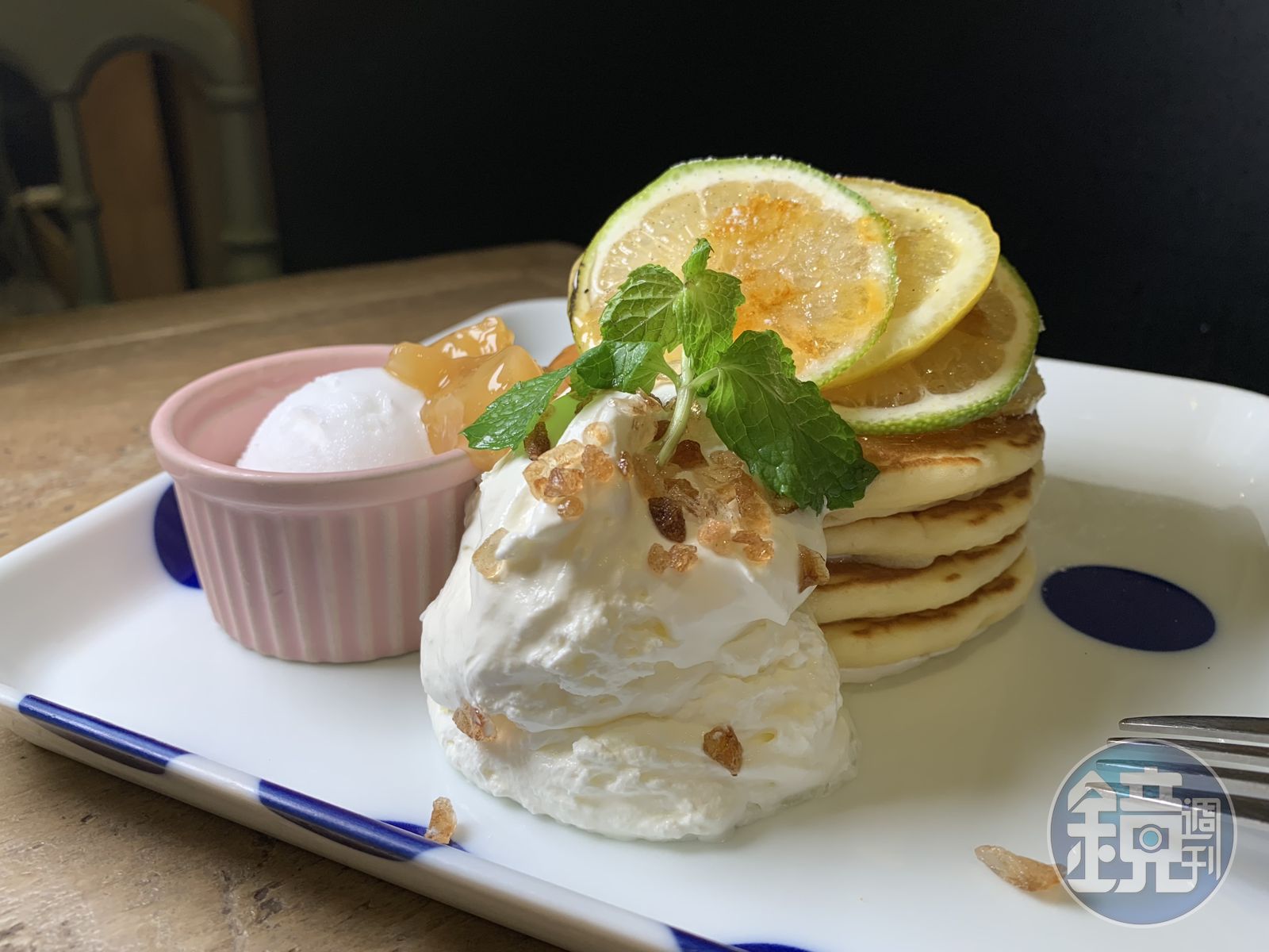 新推出的「香檸雪酪天使鬆餅」,是把帶點苦澀的青檸檬,以及有柔和酸度的黃檸檬,醃漬成焦糖檸檬片,一旁還有用北海道奶油及檸檬醬調成的香檸起司奶油,為了讓口味更有層次,還搭配自製的義式檸檬雪酪和糖漬鳳梨果粒。把軟Q的鬆餅切小塊,蘸不同的配料,滋味有鹹有甜,還有檸檬的酸爽。