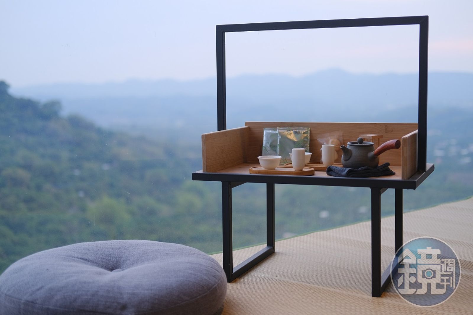 為了讓客人自在享受眼前美景,房內貼心準備了行動茶席,鋪好草蓆和坐墊,打開茶席桌,煮一壺熱水,沖泡農場自製的龍眼花茶,便可輕鬆坐臥在陽台上欣賞美景,享受難得的閒情。到了晚上,躺在面對大面窗景的浴缸中,還能舒服泡澡賞夜空。隔天清晨,沿著樟林步道散步健行,獨享清新空氣和這一片寧謐山林。