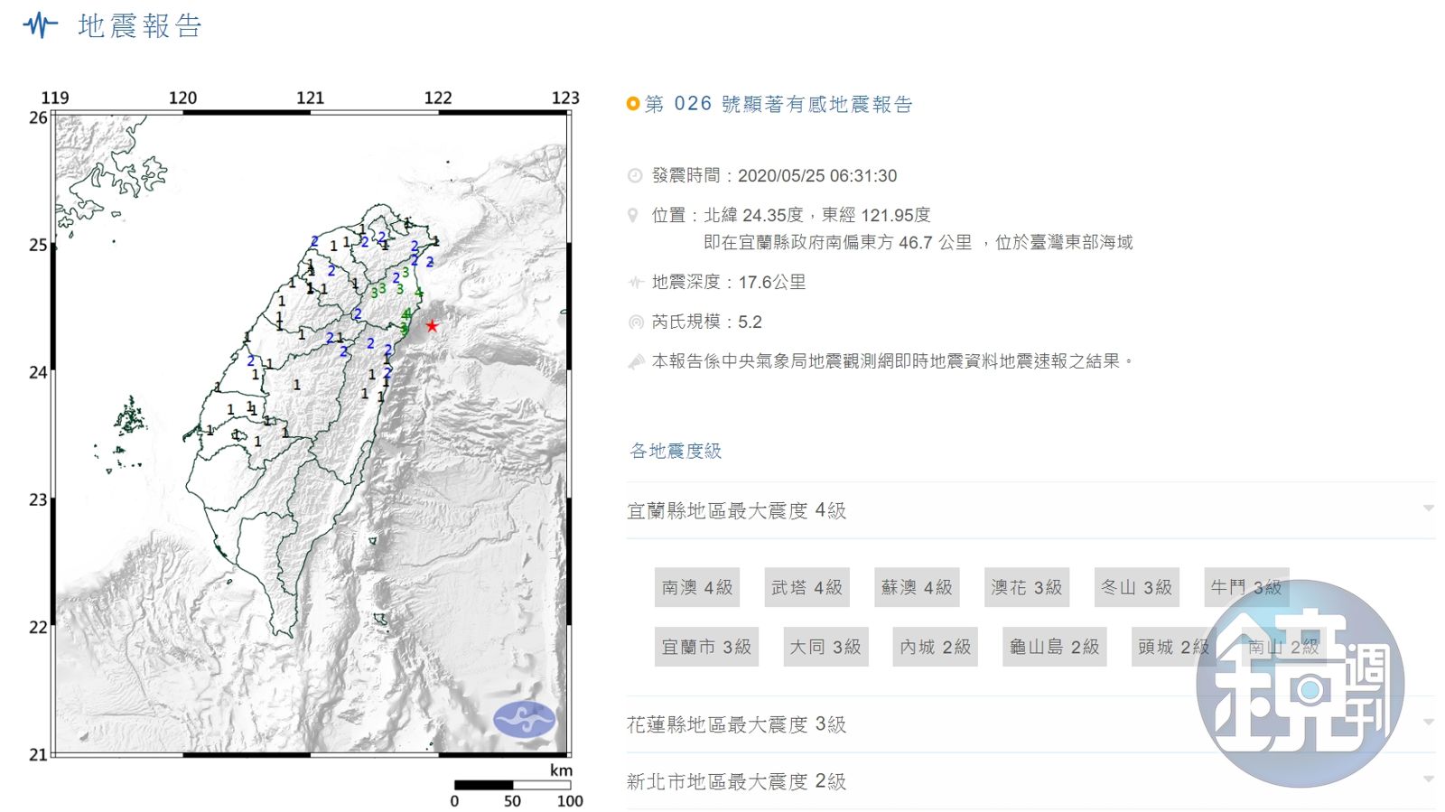 清晨地牛翻身!6點31分左右東北地區附近發生芮氏規模5.2地震,北部及東部均有明顯感覺,宜蘭縣地區最大震度為4級、花蓮縣地區最大震度為3級、台北市及新北市地區則為2級 。