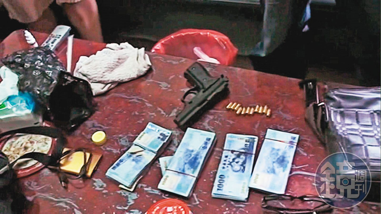 警方搜出上膛手槍、11發子彈及40萬元贓款。(翻攝畫面)發布時間:2020.06.01 05:58 臺北時間