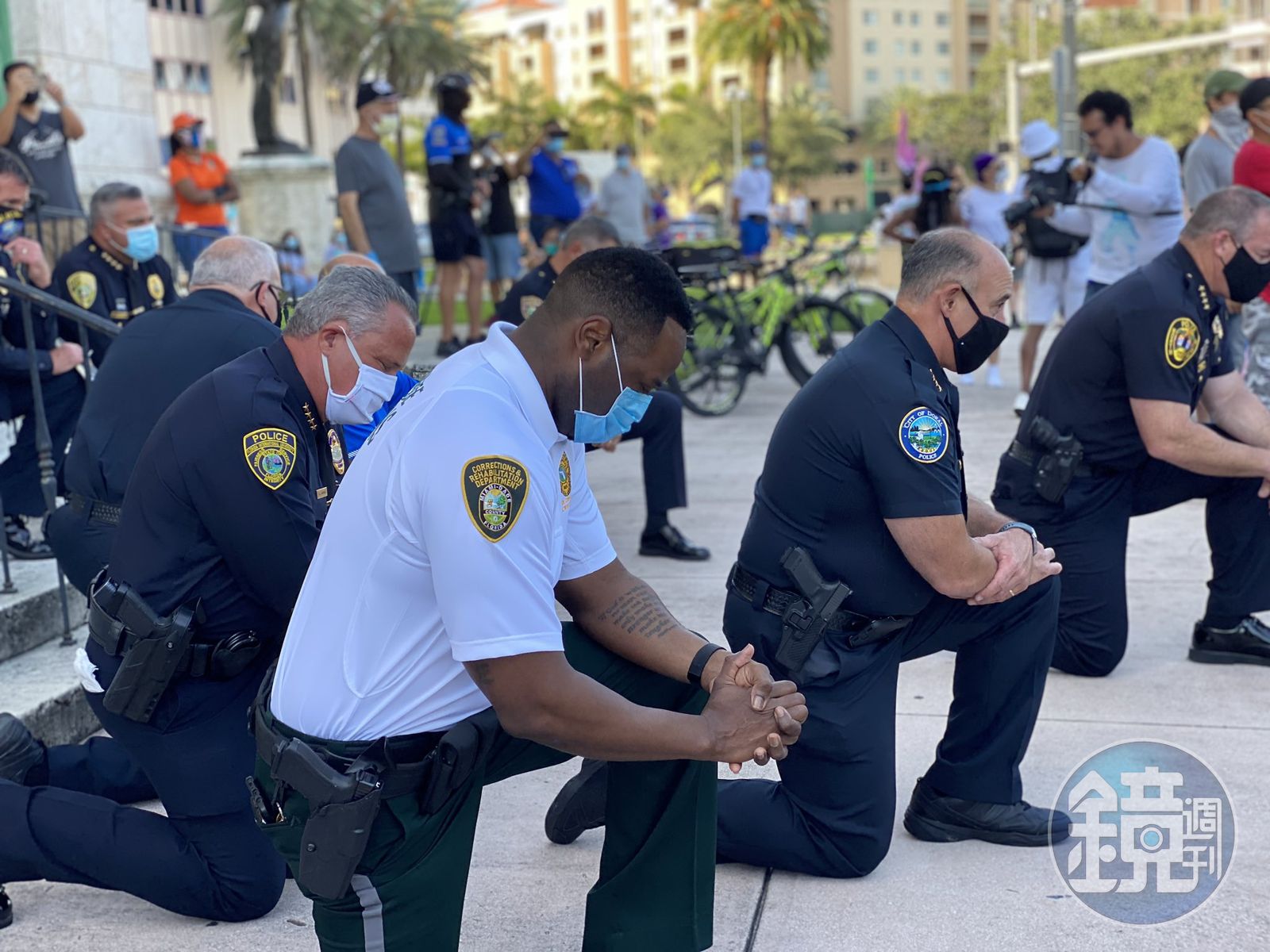 此外,在全美國各地也有許多警察在警局門口,以「單膝下跪」的方式,聲援示威民眾。單膝下跪是美式足球員卡波尼克(Colin Kaepernick)2016年為了抗議警方濫權、欺壓少數族群,在唱美國國歌時的反抗動作,如今也被美國警方效仿,象徵他們認同示威者的訴求,一起祈禱希望種族議題的問題能真正獲得改善。