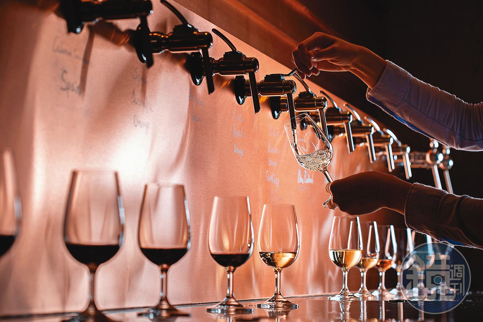 走進餐廳內,吧台後一字排開的14支水龍頭,提供常態的紅白葡萄酒以及氣泡酒、粉紅酒、啤酒和清酒等品項,讓我想起剛開始喝啤酒時,總是先點一杯,覺得對味了,才好奇詢問Bartender是哪裡的酒?當角色換成葡萄酒,忽然變成學問深奧的殿堂,對於初學者來說,最怕選錯瓶裝酒浪費酒錢,還有可能喝到地雷。