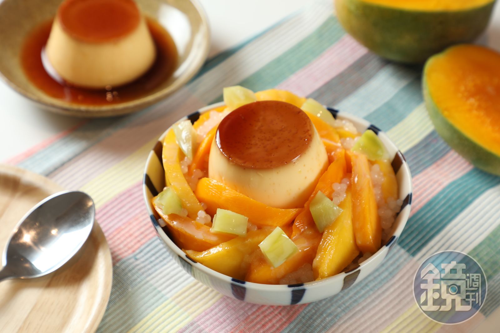 夏天呷冰標配「芒果布丁牛奶冰」,把熟度、甜度、口感略有不同的愛文及玉文芒果鋪成花瓣,頂端的自製布丁,綿密柔細,再撒上擁有近90萬粉絲、高人氣柯基犬的台南玉井老字號芒果乾「連環泡有芒果」的情人果乾,雙頰酸甜,心窩沁涼。