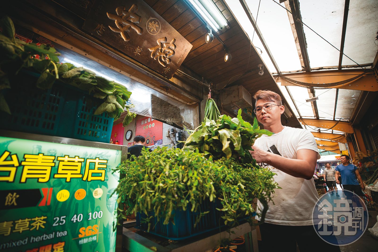 德安青草店歷史逾百年,創立人是簡宜賢的阿公林阿連,本店門口上方的老舊匾額,除了店名,還有個大大的「林」字,落款「丁亥年(1947年)孟夏」。「古早他去野外採青草然後在龍山寺旁邊擺地攤,口碑做起來才開店。」1978年出生的簡宜賢是第三代,國小開始在店裡幫忙,約莫8年前從人稱「阿來師」的父親簡萬來手中接下擔子。