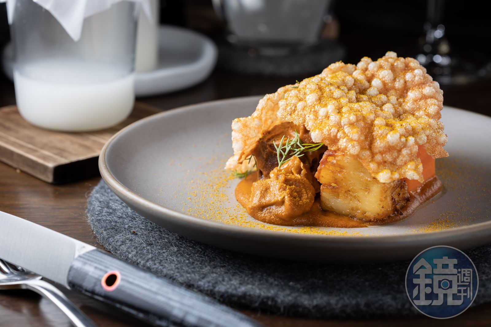 在4大美術館間路途上的景色、食物,都變成創作菜色的靈感,就像主菜「4匹の猫」,靈感來源就是青森縣立美術館內咖啡館賣的咖哩飯,拆解成濁酒調酒,以及西谷米脆片搭配千層馬鈴薯與咖哩牛肉的組合。「就像很多人到這裡,不知道旁邊的八角堂藏著奈良美智的《森之子》,我想要提醒大家青森有這些美好的細節。」