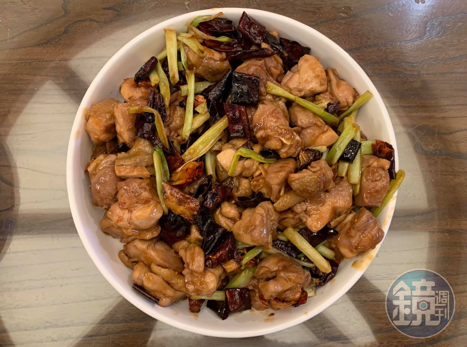 雞塊撈起瀝油後,另起一鍋,油爆香蔥段、冰糖,並加入宮保(乾煸後的乾辣椒),雞塊入鍋快炒,加素蠔油、烏醋、米酒,一收汁即起鍋。