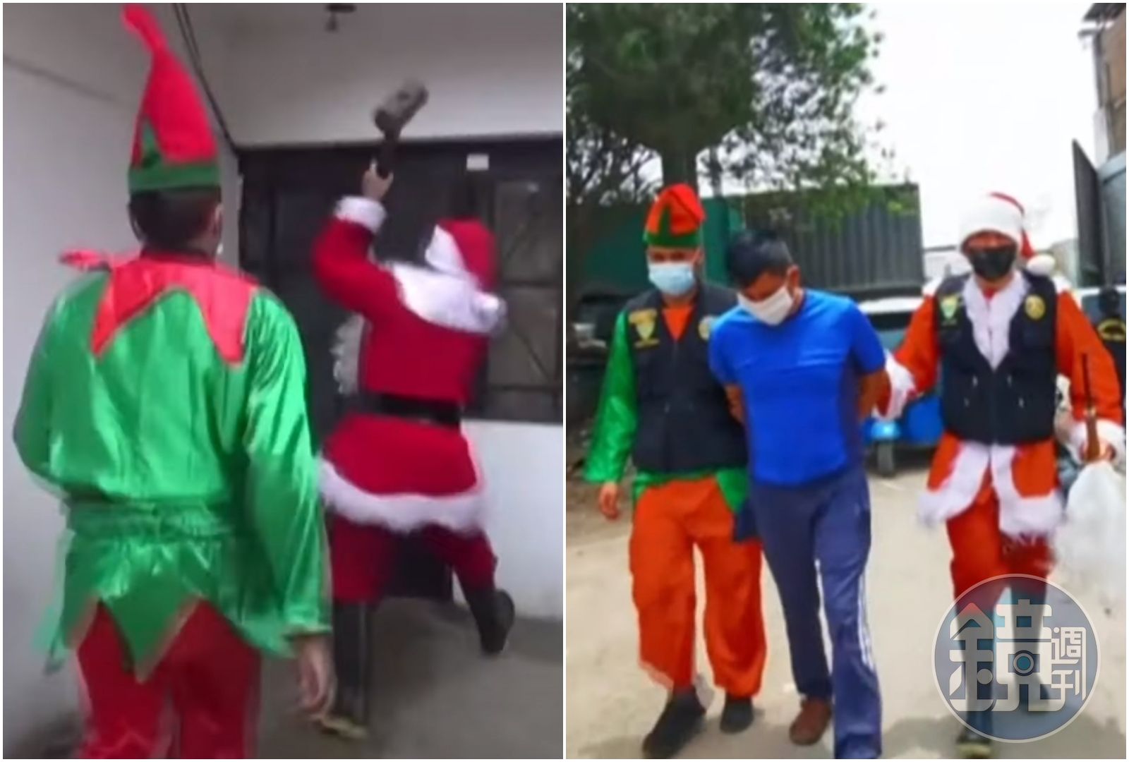 上週末在秘魯的首都利馬(Lima),當地警方裝扮成耶誕老人與小精靈,突襲毒販的家中。從錄影畫面中可以看到,兩個變裝的警察手持大榔頭,衝進一處民宅,將屋內毫無心理準備的販毒男子壓制在地。