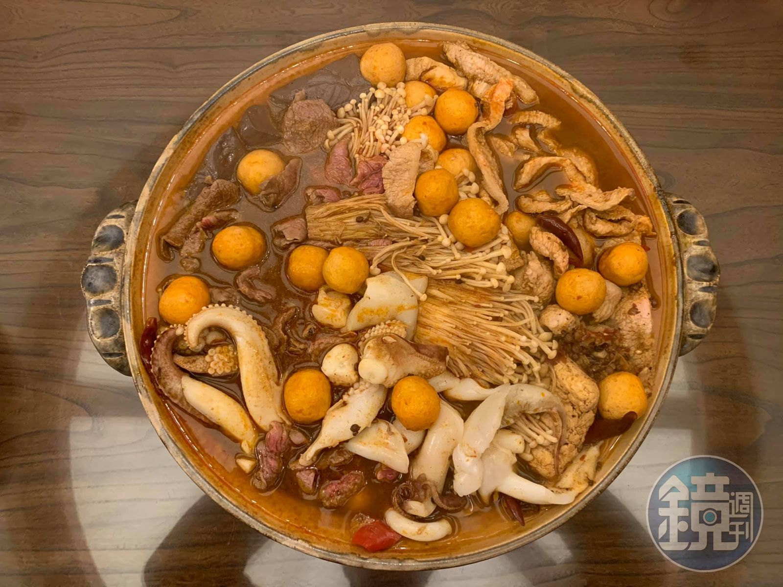 Step5:在砂鍋中放入雞高湯,取高湯1/4比例的麻辣醬,滾了之後,試味,可。依序放入黃金魚丸、臭豆腐、切塊花枝頭、切大塊鴨血、滾刀塊白蘿蔔、炸豬皮(先泡水再切長條)、金針菇及高麗菜。這些食材熟了,再放入菲力牛肉片及松阪豬肉片,肉一燙熟即起鍋上桌,最佳賞味期!