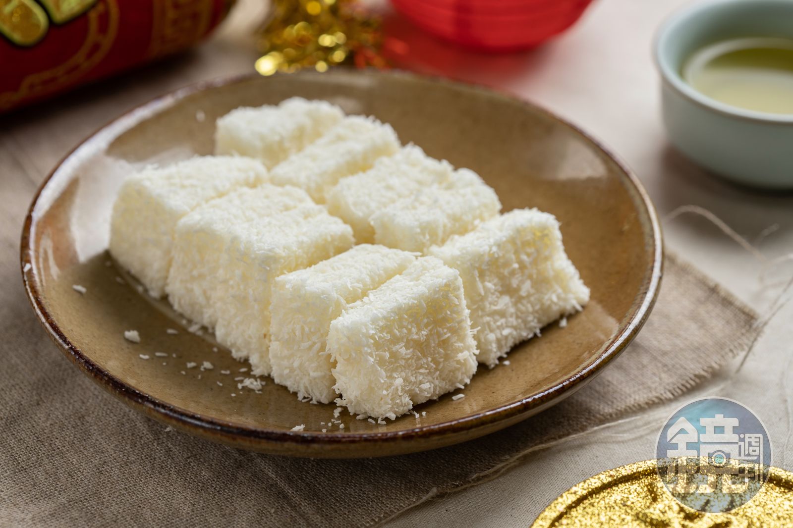 光雪花糕就用上3種粉,其中一種是「OAK全脂奶粉」,還得花好大力氣用「扯」的,扯出Q度,「讓它在爐子上邊煮邊扯,要扯到完全不帶水分、筋性出來,得花半小時。」撒上椰子粉的雪花糕,冰冰吃軟Q、奶香濃,不愛椰子也可選裹上特調穀粉的日式雪花糕,穀香淡雅。