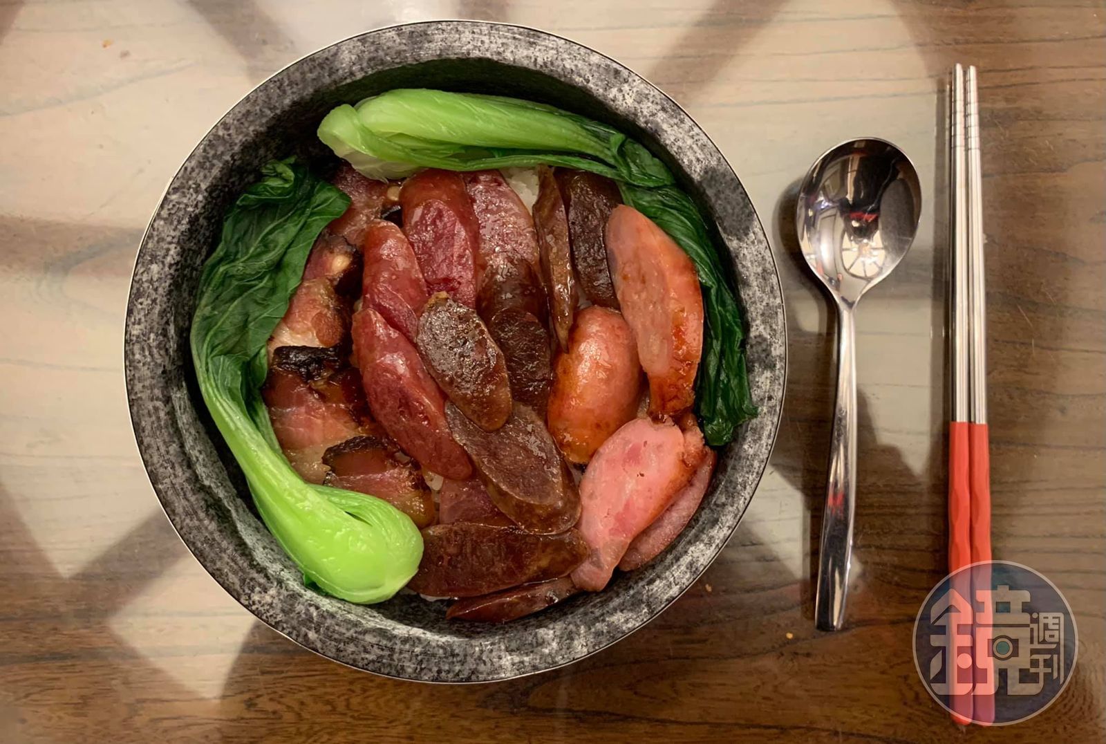 Step8:石鍋內塗油,放在瓦斯爐上用小火烤炙。將米飯盛入石鍋,排上大量的肝腸、臘肉、臘腸、青江菜和台灣香腸,大約10分鐘,聞到鍋粑香味,淋上一瓢醬汁(也可不淋)。將石鍋上桌,即為臘味煲仔飯。